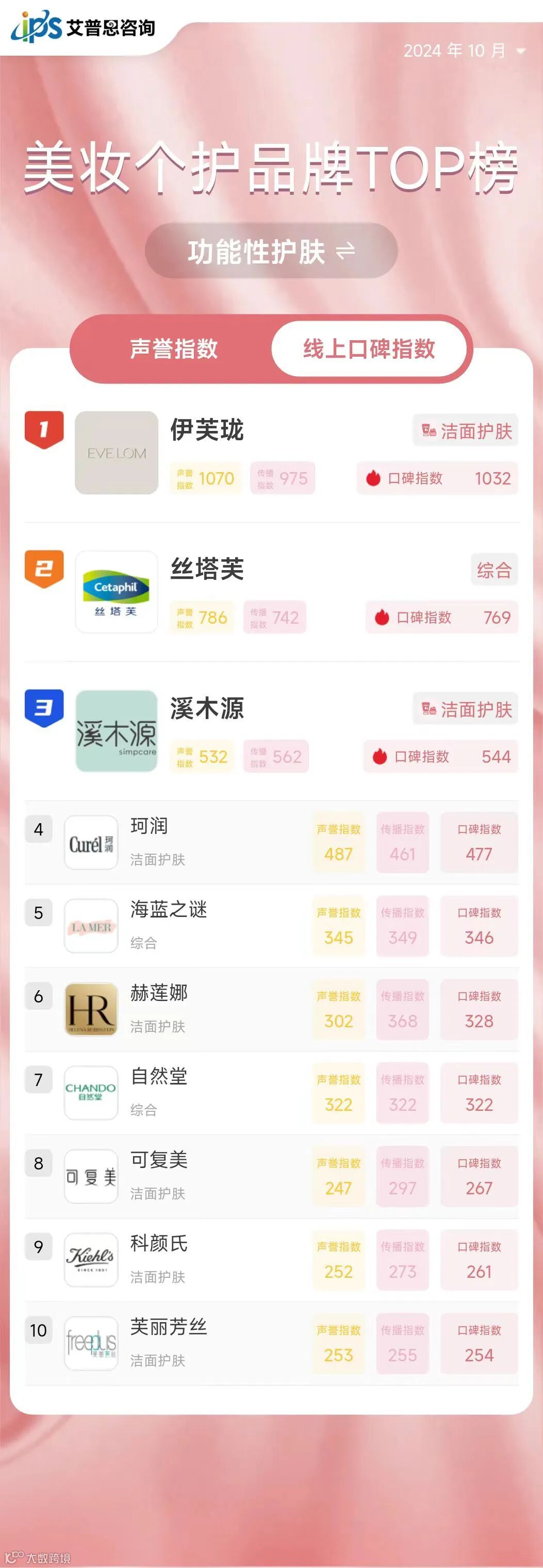 线上口碑指数排名前三的功能性护肤品牌为:伊芙珑*、丝塔芙、溪木源*。