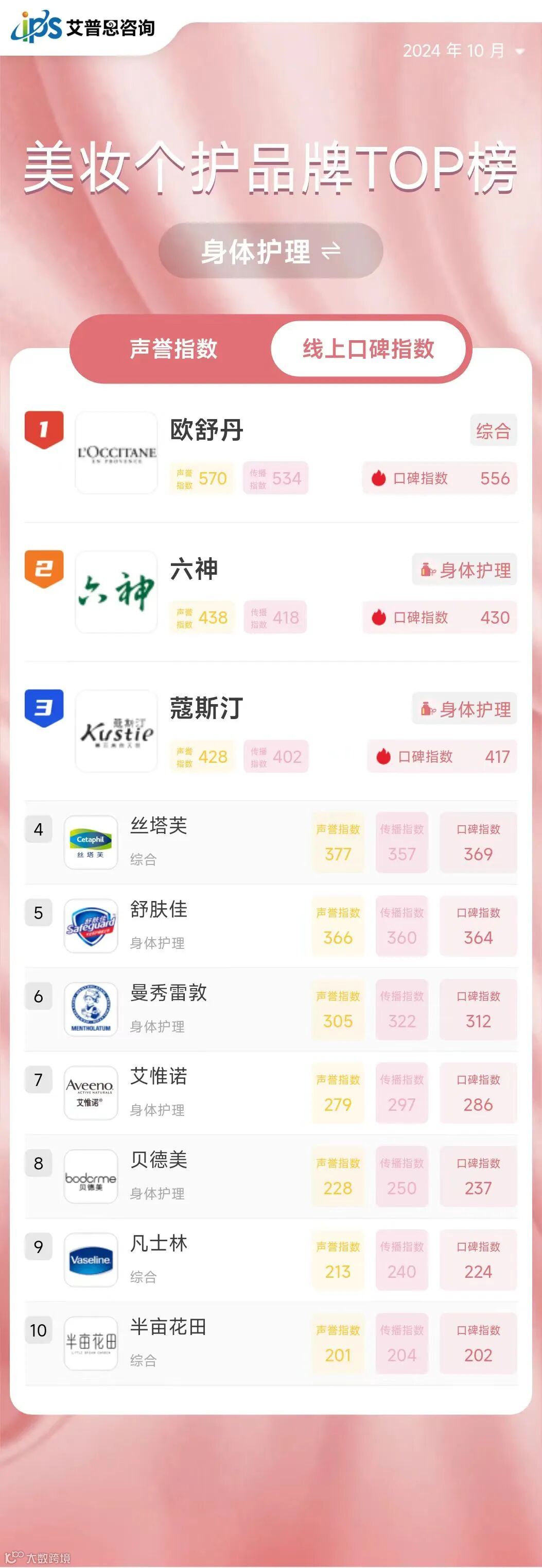 线上口碑指数排名前三的身体护理品牌为:欧舒丹*、六神*、蔻斯汀*;线上口碑指数排名前三的口腔护理品牌为:舒客、高露洁、飞利浦*;线上口碑指数排名前三的美发护发品牌为希思黎*、欧舒丹*、海飞丝*。