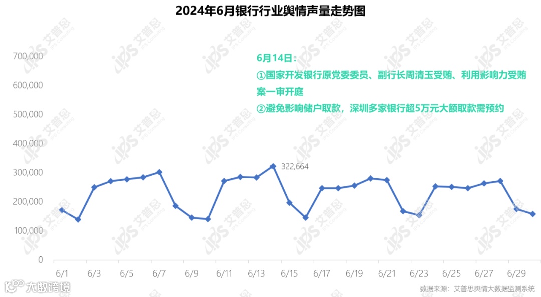 艾普思舆情大数据监测系统显示,6月,涉及银行业的舆情声量为6,931,376篇次,环比下降约14.35%(2024年5月舆情声量为8,093,937篇次),日均声量达231,045篇次。声量高峰主要出现在6月14日(平均声量322,664篇次),主要受“国家开发银行原党委委员、副行长周清玉受贿、利用影响力受贿案一审开庭”、“避免影响储户取款,深圳多家银行超5万元大额取款需预约”等相关信息影响。