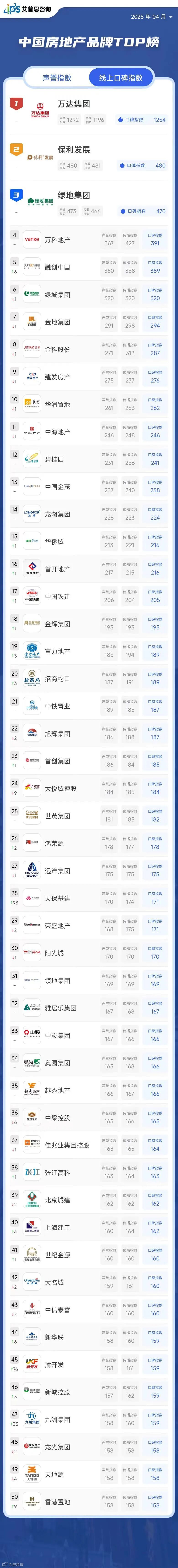 艾普思指数|2025年03月中国房地产品牌线上口碑指数TOP50