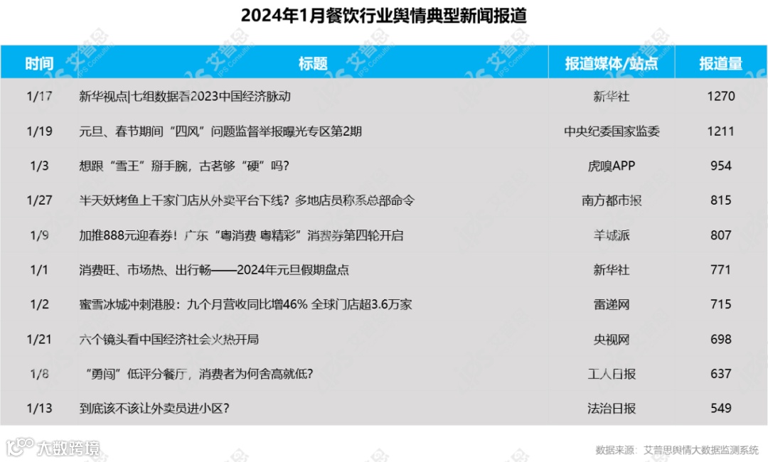 本报告基于2024年1月餐饮业线上公开舆情数据,从行业发展状况、舆情态势、酒企舆情表现、社交媒体舆情监测数据、重点舆情话题及事件等维度,对本月餐饮行业网络舆情进行追踪和解读,以期为餐饮行业及餐饮声誉风险管理提供参考。