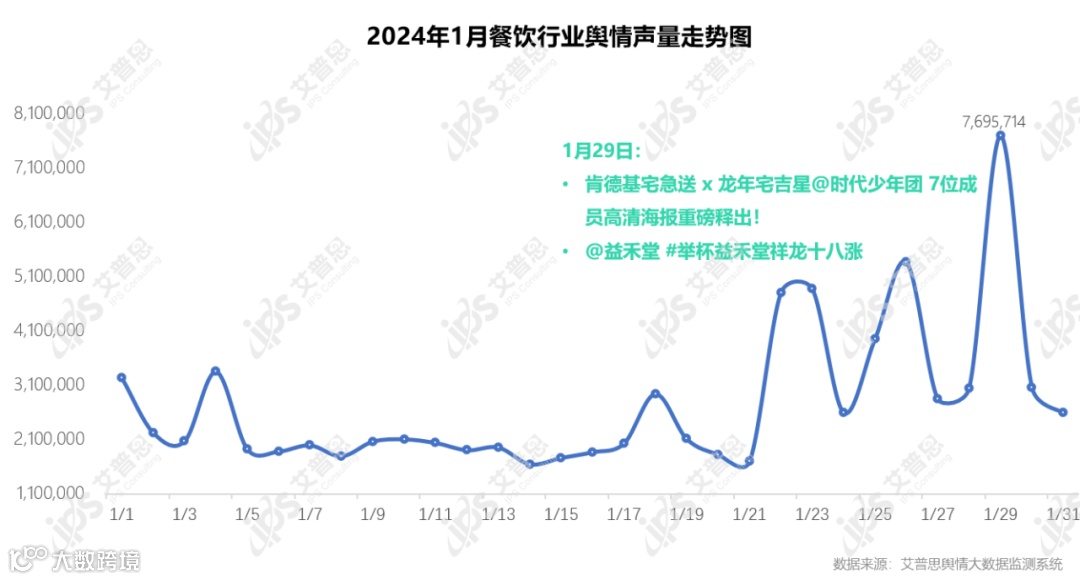 从声量走势来看,声量高峰期在1月29日,主要由“肯德基宅急送 x 龙年宅吉星@时代少年团 7位成员高清海报重磅释出!”“举杯益禾堂祥龙十八涨”相关报道带动声量。