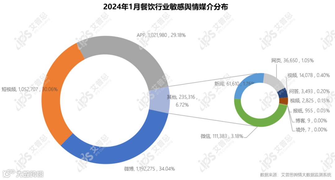 1月,餐饮行业敏感舆情声量来源中,占比最高的媒介为微博,达34.04%,舆情声量为1,192,275篇次;其次为短视频,舆情声量达1,052,707篇次,占比30.06%;APP舆情声量1,021,980篇次,占比29.18%。