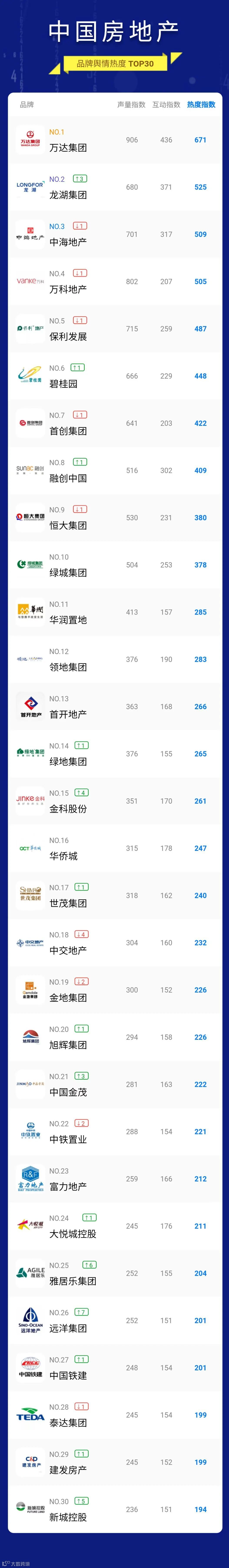 金科股份舆情热度指数由第19位升至第15位,其声量及互动量分别较上月增长17%、30%。舆情热度指数显著提升的还有中国金茂、雅居乐集团、远洋集团、新城控股等。