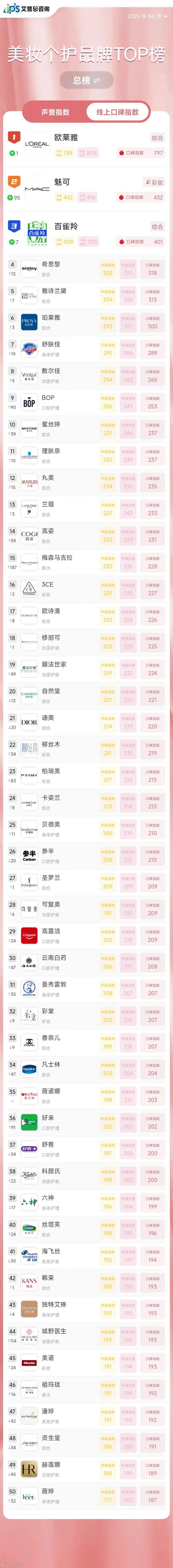 2025年6月线上口碑指数排名前三的美妆个护品牌为:欧莱雅(综合,口碑指数797,排名较上月上升1位)、魅可(彩妆,口碑指数432,排名较上月上升95位)、百雀羚(综合,口碑指数401,排名较上月上升7位)。
