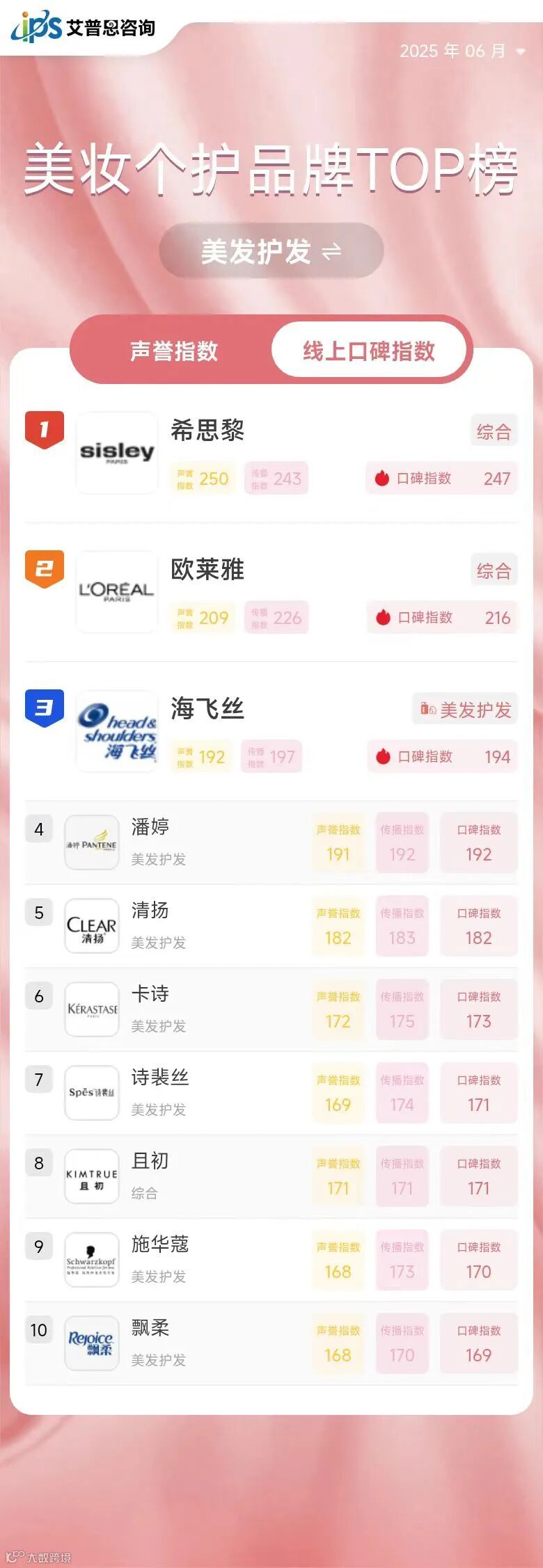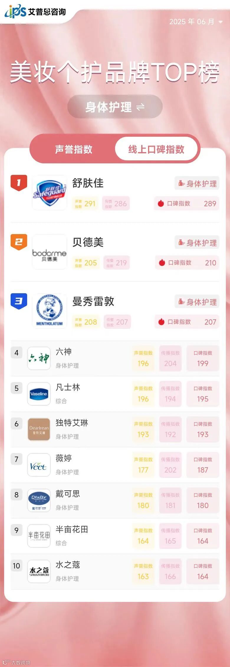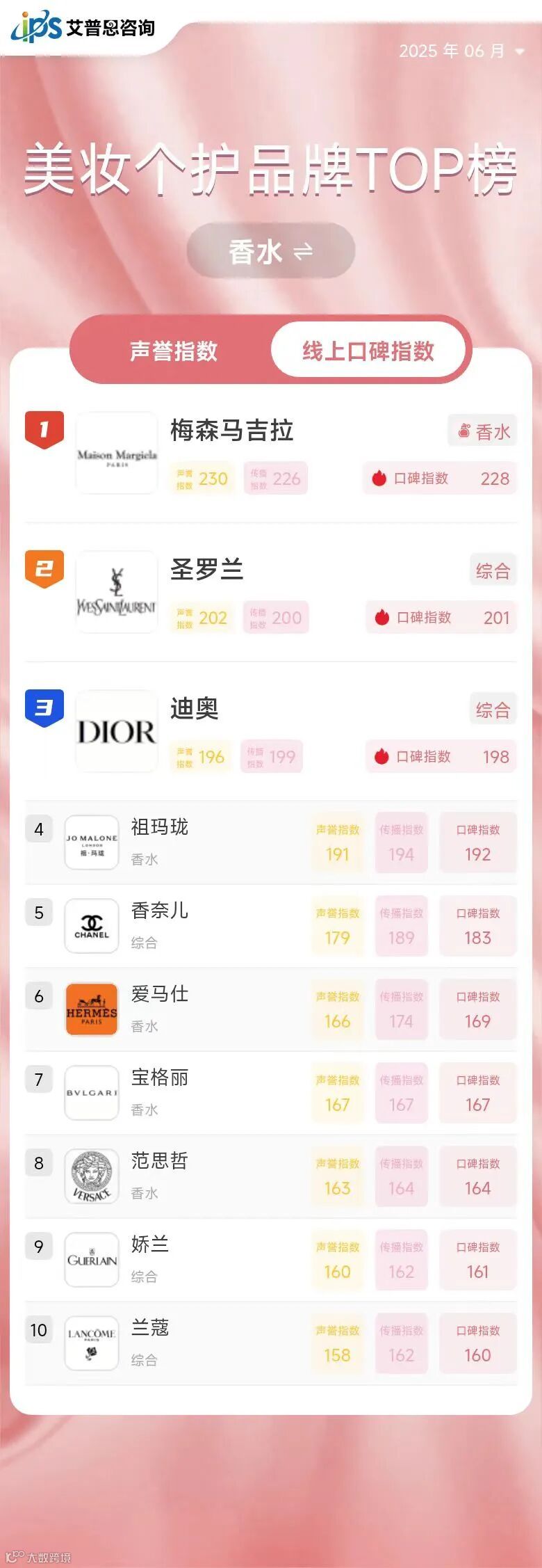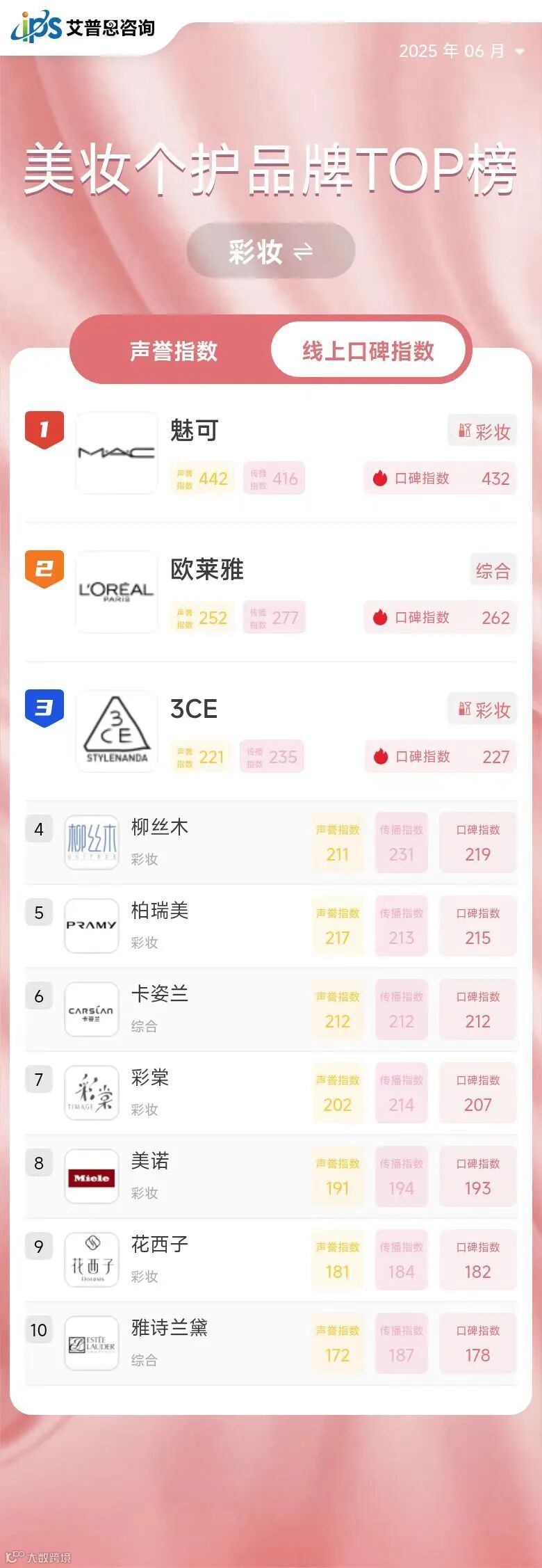 根据中国香妆协会发布的数据显示,2024年中国化妆品线上交易规模为6910.52亿元,同比增长5.86%,占比高达64.35%;线下交易规模为3827.7亿元,同比下滑2.28%,占比35.65%。美妆品牌线上销售规模进一步扩大,消费者评价及经验分享通过网络迅速传播,直接影响着品牌声誉与销售业绩。艾普思指数原创榜单《中国美妆个护品牌线上口碑指数排行榜》旨在依托互联网文本大数据分析技术,助力美妆个护品牌精准洞察线上口碑,有针对性地实施产品及品牌策略,升级品牌形象,谋求高质量发展,从而在后疫情时代的行业竞争中脱颖而出。