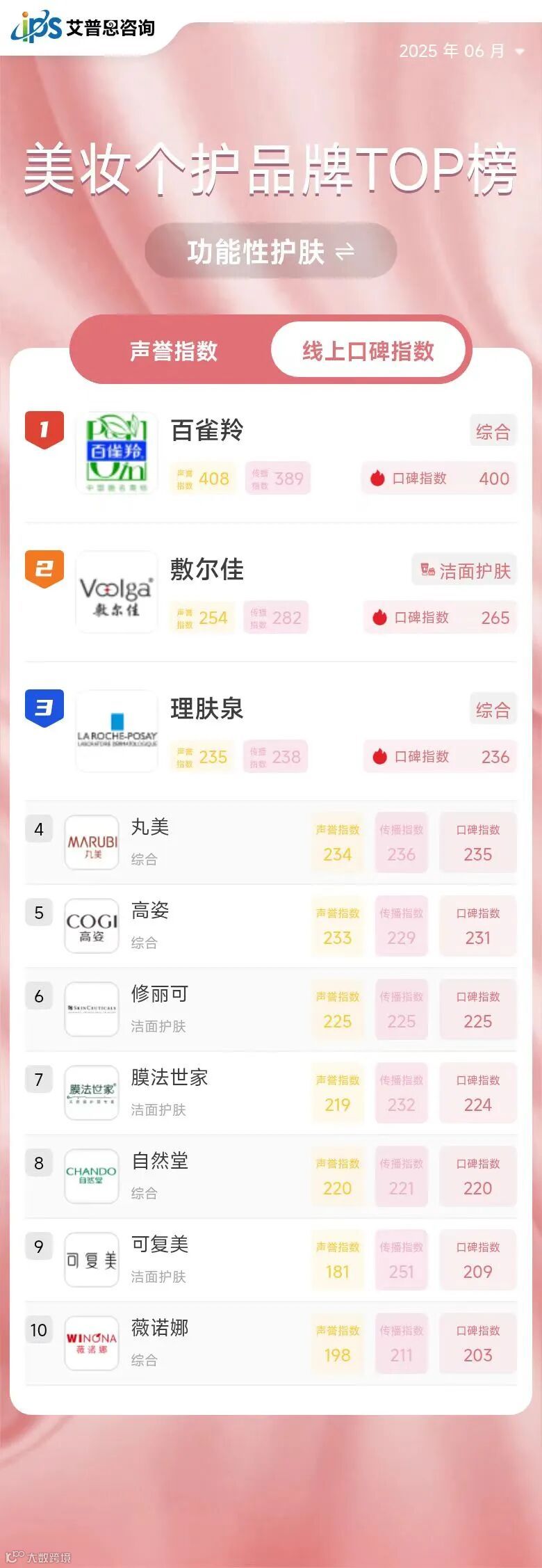 线上口碑指数排名前三的功能性护肤品牌为:百雀羚*、敷尔佳、理肤泉*。