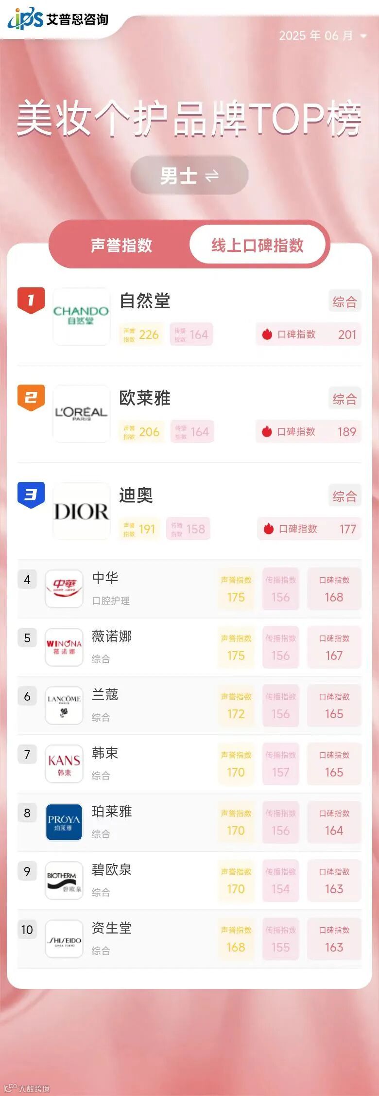 线上口碑指数排名前三的男士美妆个护品牌为:自然堂*、欧莱雅、迪奥*。