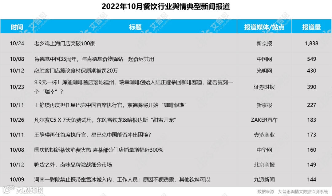 以上内容节选自《艾普思咨询:2022年10月餐饮行业舆情监测报告》(共16页,约4,138字)。