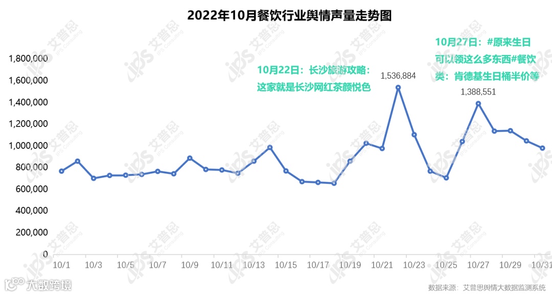 艾普思舆情大数据监测系统显示,10月,涉及餐饮行业的舆情声量为27,508,625篇次,较上月有小幅度下降(24,894,177篇次),日均声量达887,375篇次。从声量走势来看,10月餐饮行业舆情态势上旬整体波动较平稳,下旬整体波动较大,出现两个极值,主要由话题“长沙旅游攻略提及茶颜悦色”、“生日在餐饮类可以领这么多东西”带动声量。