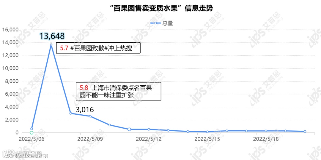 5月8日,上海市消保委点名百果园;媒体集中发表评论报道,澎湃新闻、每日经济新闻等主流媒体均有参与;5月9日开始,舆情逐渐归于平息。