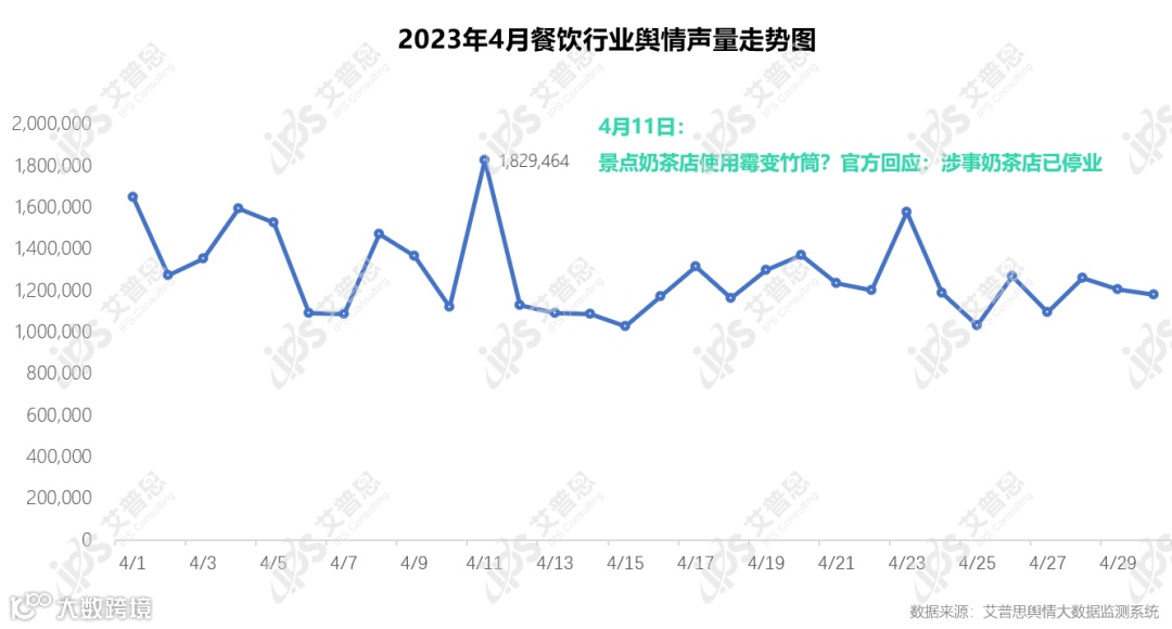艾普思舆情大数据监测系统显示,4月,涉及餐饮行业的舆情声量为38,316,569篇次,较上月有所上升(3月舆情声量为34,887,793篇次),日均声量达1,277,219篇次。从声量走势来看,声量高峰期在4月11日,主要由 “景点奶茶店使用霉变竹筒?官方回应:涉事奶茶店已停业”带动声量。