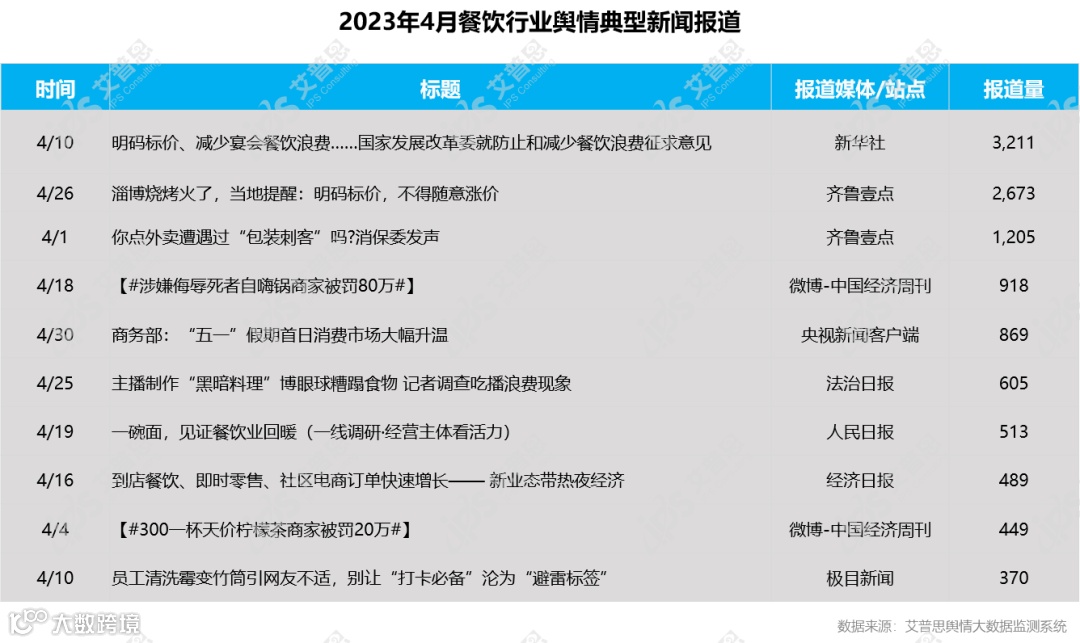 以上内容节选自《艾普思咨询:2023年4月餐饮行业舆情监测报告》(全文20页,约4,600字)。
