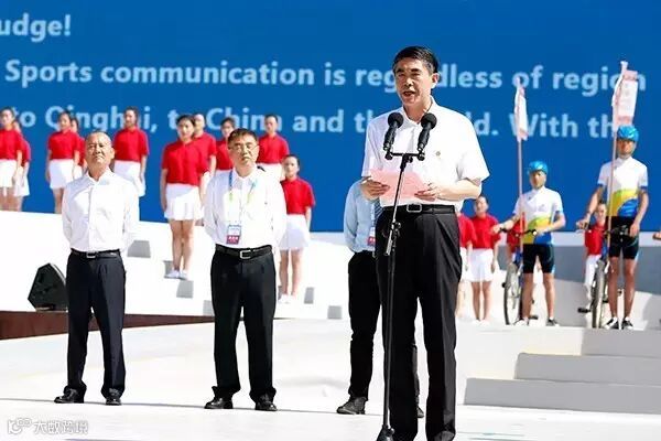 青海省委副书记、省长王建军在开幕式上讲话。王建军说,体育事业是一项开放的事业,体育交流不分地区和国界。环湖赛既属于青海,也属于中国,更属于世界。承载着“绿色、人文、和谐”精神的环湖赛已经走过了16年的不凡历程。历经16年的执着坚守,16年的磨砺创新,16年的发展进步,环湖赛正朝着国际化、专业化、市场化、品牌化的目标迈进,吸引了全国乃至全世界的目光,其影响和作用已经远远超出了体育赛事本身,成为青甘宁三省区各族人民的盛大节日和对外交往交流交融的重要平台,成为宣传大美青海、绚丽甘肃、塞上宁夏和展示古丝绸之路文明的靓丽名片。