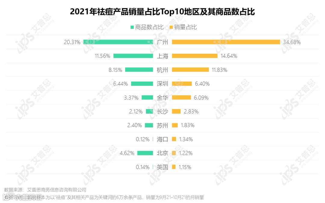 从发货地来看,广州祛痘商品的销量占比34.68%,远高于其他销量排行前十的城市/国家。阿里大数据显示,广州美妆凭借线上交易规模大、品牌创新能力强、聚集程度高等优势入选2020年全国十大产业带TOP1;广州美妆产业链齐全,是行业企业生存发展的优质土壤。