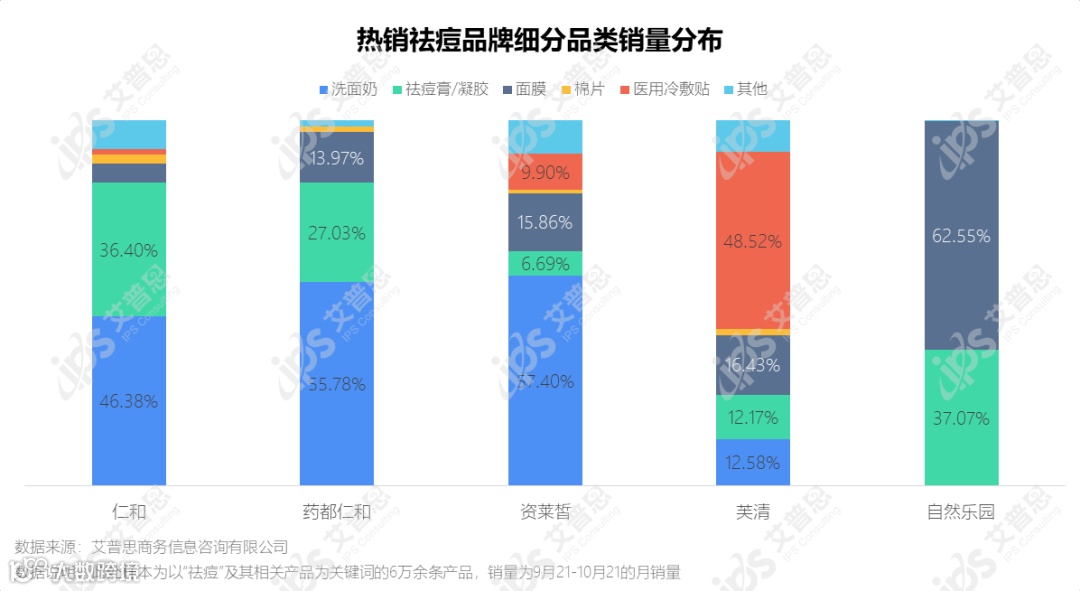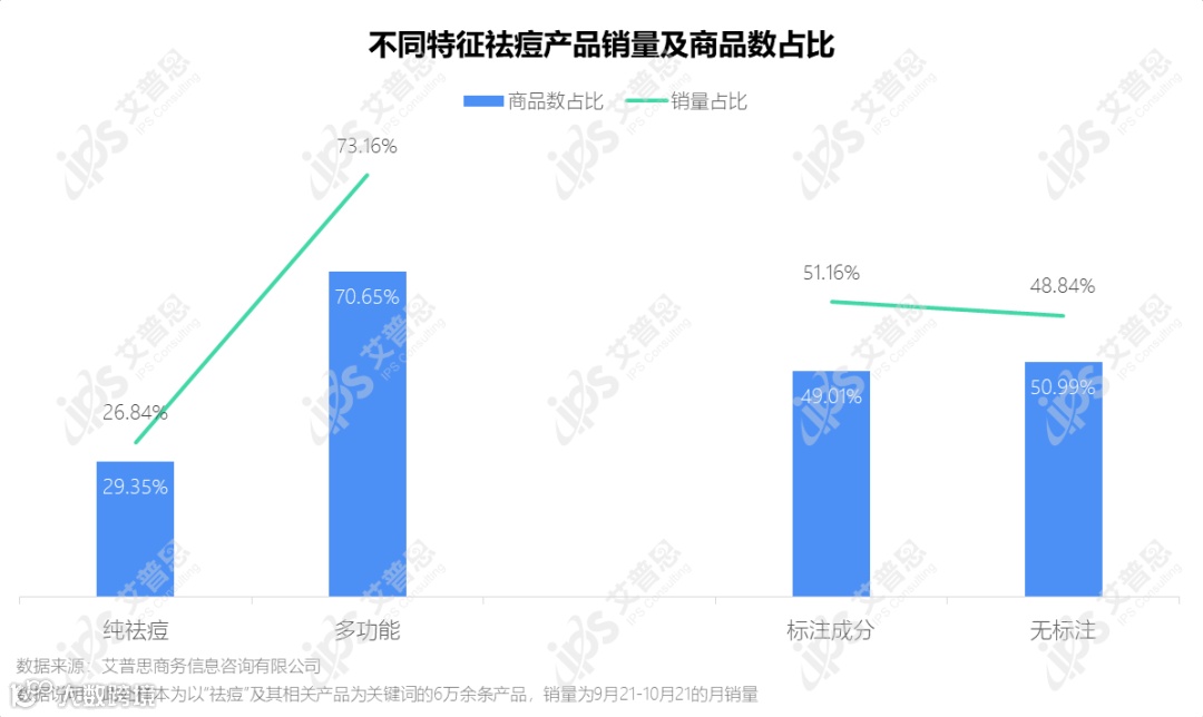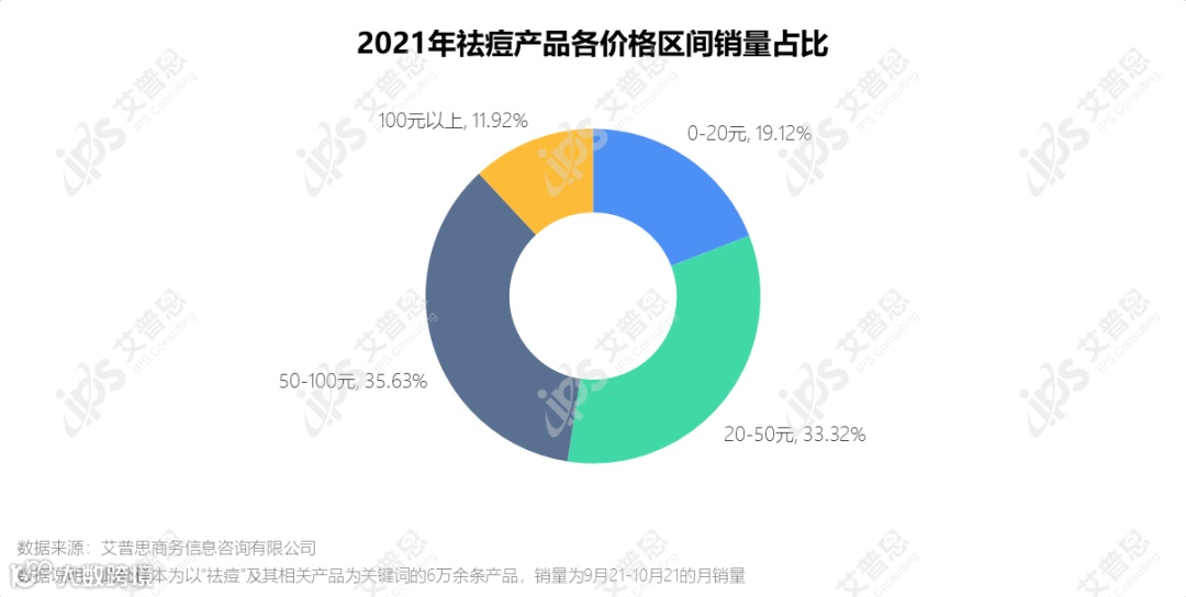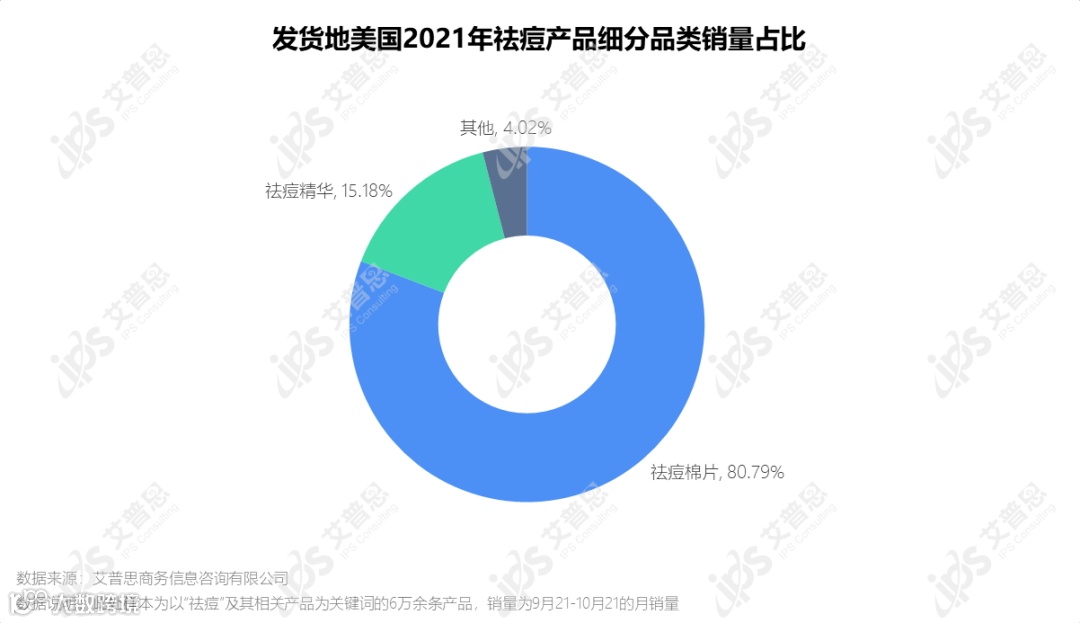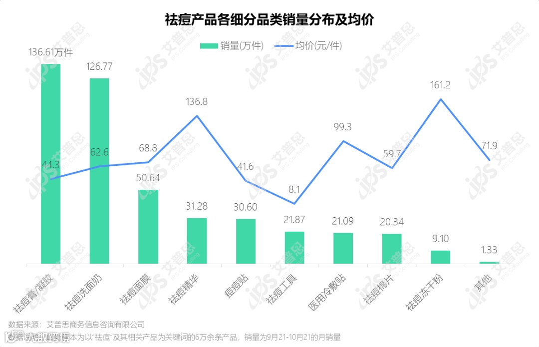 国内某主流电商平台公开数据显示,祛痘相关商品约6.1万件,近一个月(2021.9.21-2021.10.21)的销量为465.45万件,交易额达2.92亿元。