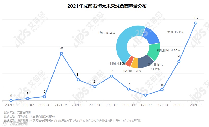 “成都市恒大未来城房屋质量不达标,小区没有大门”相关负面消息从2021年2月开始传播,4月中旬起舆情声量迅速抬升并达到峰值(70条)。经反复沟通,该小区住宅业主与商业业主双方分歧仍较大,围墙草案无法确定,相关负面信息持续发酵,并于12月达到新的峰值(115条),相关信息主要分布在微信、腾讯新闻、四川日报网、腾讯网等站点。