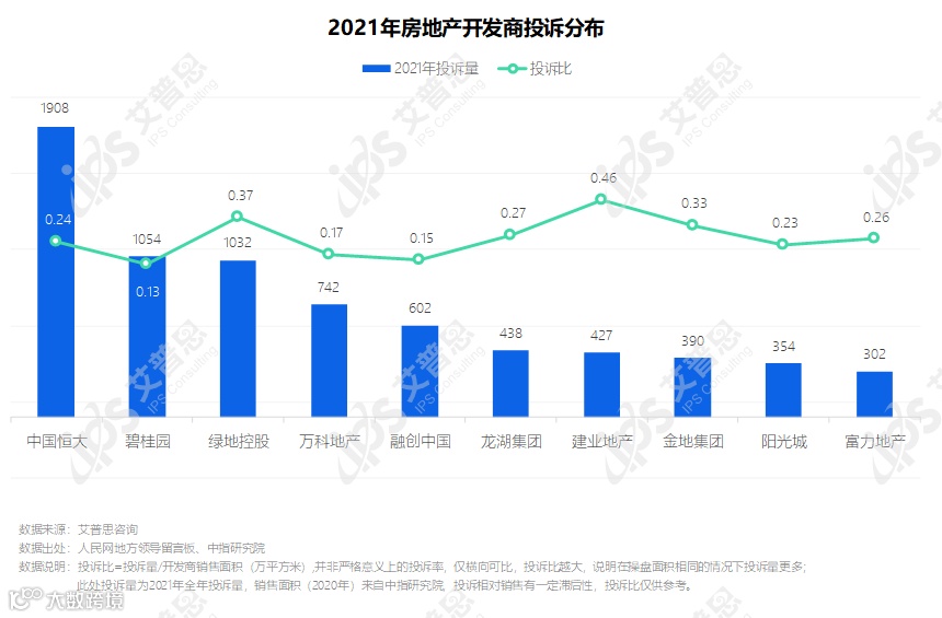 2021年,投诉量前五的开发商为中国恒大、碧桂园、绿地控股、万科地产、融创中国。结合销售面积来看,碧桂园、万科地产、融创中国投诉比分别为0.13、0.17、0.15,远低于前十平均值(0.26),口碑表现较好。