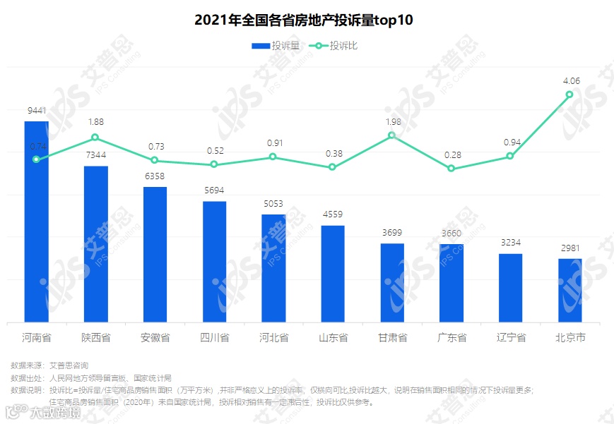 2021房地产投诉地域分布:北京市、甘肃省、陕西省投诉比明显偏高