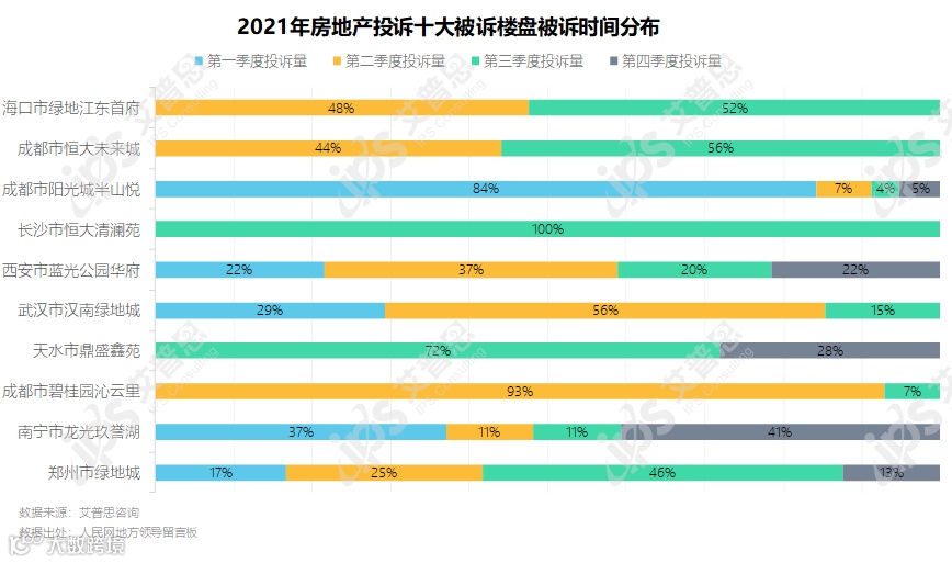 十大被诉楼盘中,部分楼盘问题得到解决(或业主情绪得到安抚),被诉时段仅分布在某一个或两个季度,如长沙市恒大清澜苑、海口市绿地江东首府、成都市恒大未来城、成都市碧桂园沁云里等;另有部分楼盘问题一直无法解决,造成业主在本年度持续投诉,如南宁市龙光玖誉湖、西安市蓝光公园华府、郑州市绿地城等。