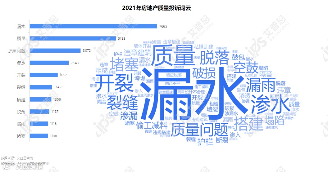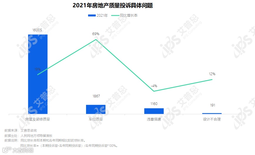 2021年,质量投诉中房屋及装修质量相关投诉1.60万起,较去年增长19%;车位质量相关投诉1867起,较去年大幅增长68%;设计不合理相关投诉191起,较去年增长12%;违规搭建相关投诉1160起,较去年下降4%。