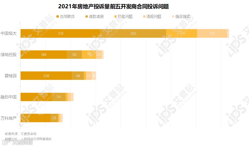 2021年,人民网地方领导留言板共收到房地产投诉7.64万起,较去年增长62.55%。值得关注的投诉事件有:海口市绿地江东首府涉嫌虚假宣传且房屋质量不达标、成都市恒大未来城房屋质量不达标,小区没有大门和围墙、成都市阳光城半山悦公区装修缩水、长沙市恒大清澜苑购房后无法网签备案及资金未到监管账户等。