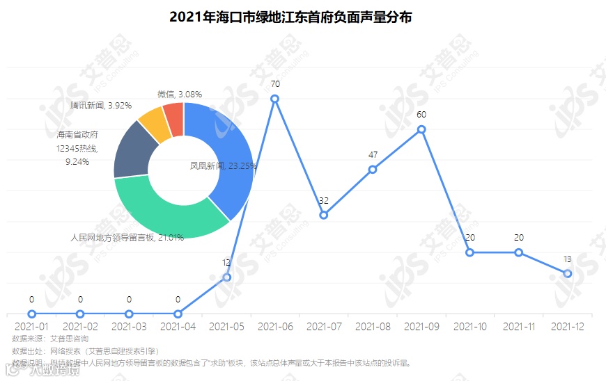 “海口市绿地江东首府房屋质量不达标”相关负面信息最早出现在2021年5月,于6月、9月分别达到两个声量高峰,10-12月仍有少量信息传播。相关信息主要分布在凤凰新闻、人民网地方领导留言板、海南省政府12345热线、腾讯新闻等站点。