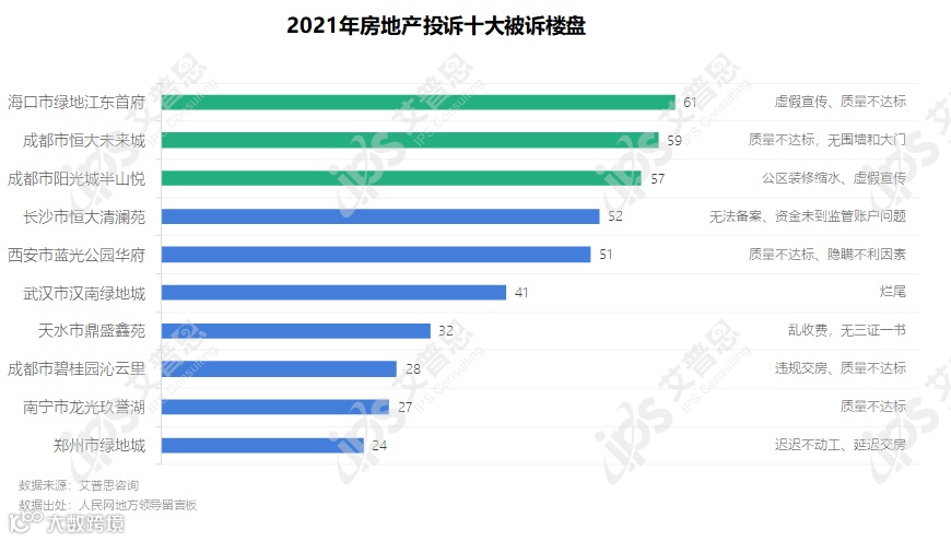 2021年,被诉量前三的楼盘为海口市绿地江东首府、成都市恒大未来城、成都市阳光城半山悦。