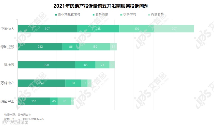 服务投诉方面,中国恒大在各方面收到的投诉均较多,其中物业及配套服务、服务态度、办证服务相关投诉量均超过200起。