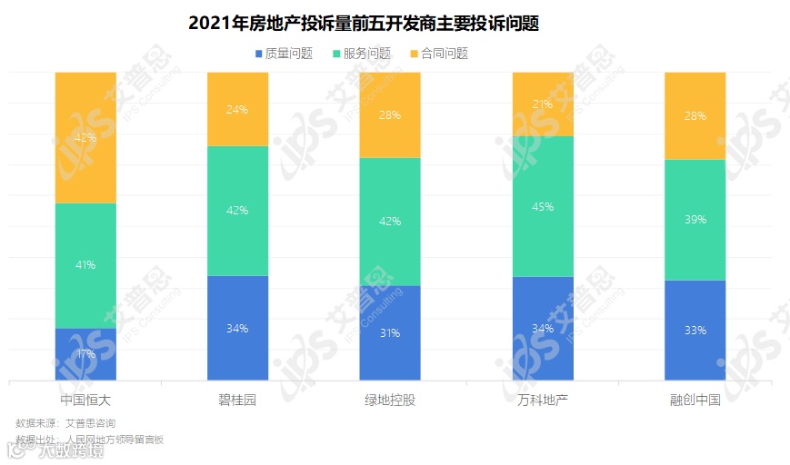中国恒大、碧桂园、绿地控股、万科地产、融创中国投诉量排前五,结合销售面积考虑,绿地控股投诉比偏高,碧桂园、万科地产、融创中国口碑表现良好。