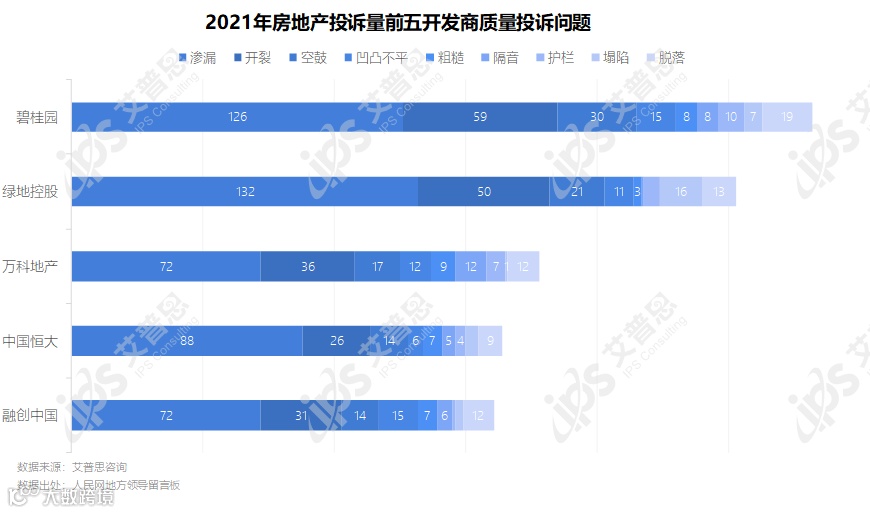 各开发商质量投诉具体问题中,渗漏、开裂为主要问题,绿地控股、碧桂园收到的渗漏相关投诉都在100起以上,收到的开裂相关投诉在50起以上;万科地产、中国恒大、融创中国收到的渗漏相关投诉超70起。