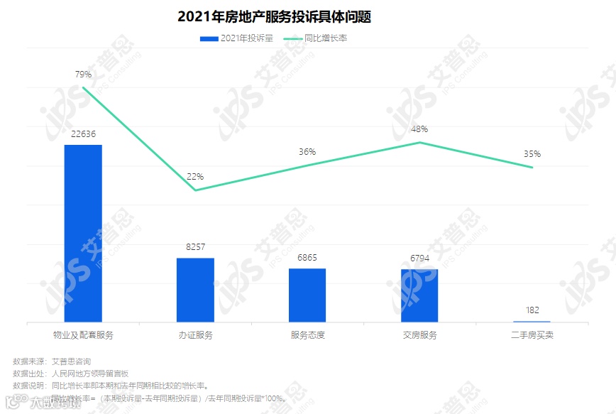 2021年,服务类投诉中,物业及配套服务投诉量较去年大幅增长79%,达2.26万起,其中涉及停车费、电费、维修基金等问题的投诉较多;办证服务投诉量8257起,较去年增长22%,主要投诉问题为无法办理房产证;服务态度相关投诉6865起,较去年增长36%,其中办事推脱推诿、威胁业主等问题投诉较多;交房服务投诉6794起,较去年增长48%,主要涉及延期交房。