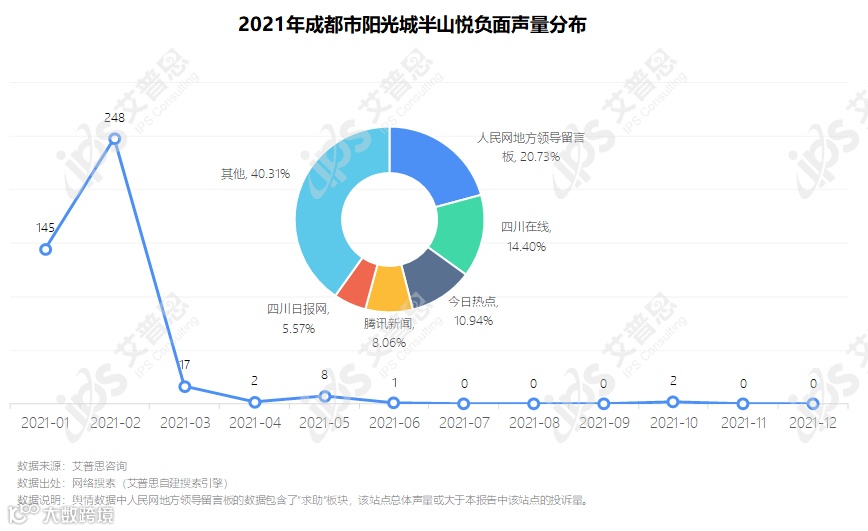 据艾普思自建搜索引擎数据,“成都市阳光城半山悦公区装修缩水、涉嫌虚假宣传”相关负面消息在2020年7月已有少量传播,自12月中旬起舆情声量逐渐抬升,于2021年2月达到峰值(248条)。相关信息主要分布在人民网地方领导留言板、今日热点、四川在线、腾讯新闻等站点。