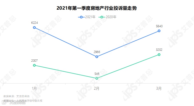 2021年1-3月,人民网领导留言板共收到房地产投诉约1.5万起,同比增长160%。剔除去年同期疫情影响,今年第一季度的月均投诉量(5,010起)仍较去年4月之后的月均投诉量(4,584)增长9%。