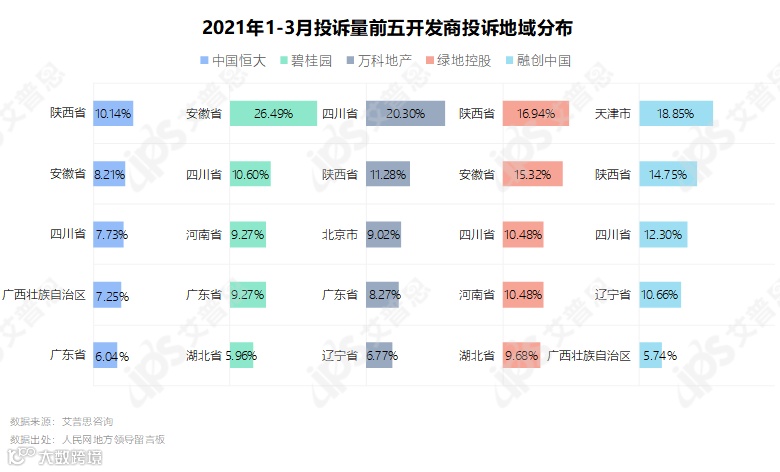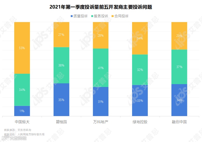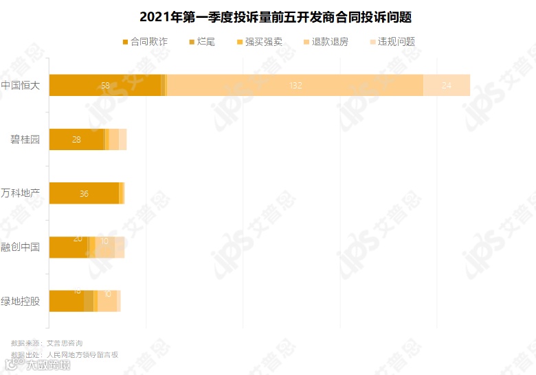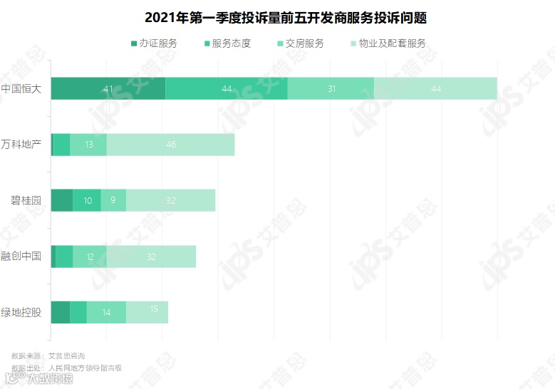 1-3月投诉量前五的开发商为中国恒大、碧桂园、万科地产、绿地控股、融创中国,投诉量均在100起以上。