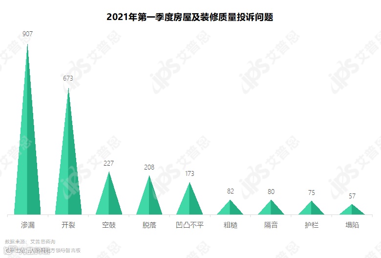 房屋及装修质量投诉的主要问题包括渗漏、墙壁开裂、墙面空鼓、墙皮脱落等,其中出现渗漏、墙壁开裂问题最多,涉及投诉量分别为907起、673起。