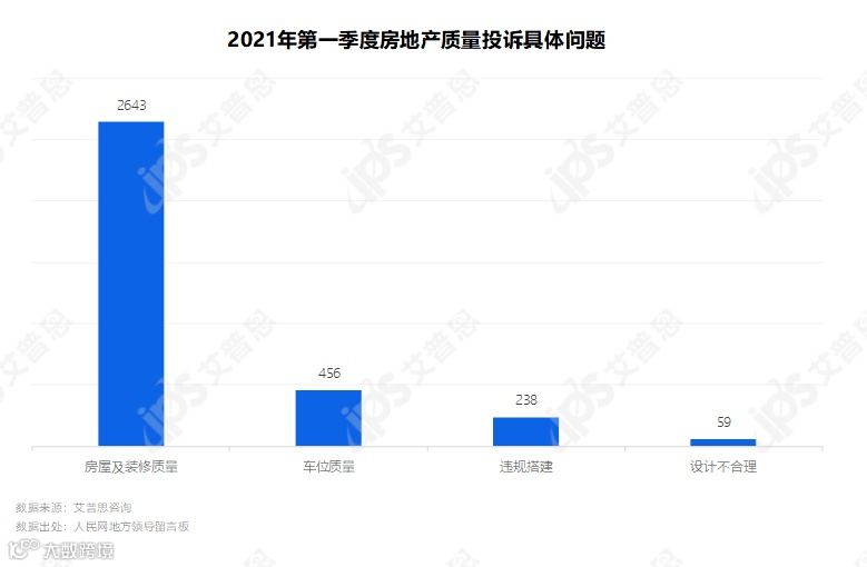 第一季度的质量投诉中仍以房屋及装修质量相关投诉为主,达2,643起,其次是车位质量(456起,不到前者的1/5)、违规搭建(238起)和设计不合理(59起)。