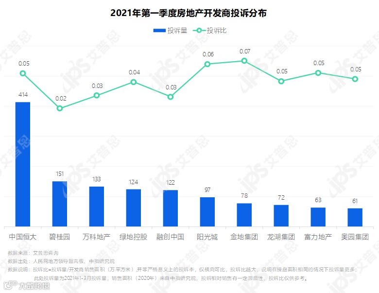 中国恒大、碧桂园、万科地产、绿地控股、融创中国投诉量排在前五,结合操盘体量考虑,投诉比并未明显偏高。