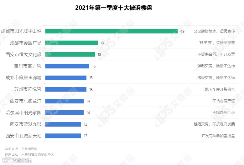 2021年1-3月,被投诉最多的楼盘为成都市阳光城半山悦,涉及投诉共48起,其中入户过道狭窄、公区装修缩水、容积率及绿化率与宣传不符等问题提及率较高.