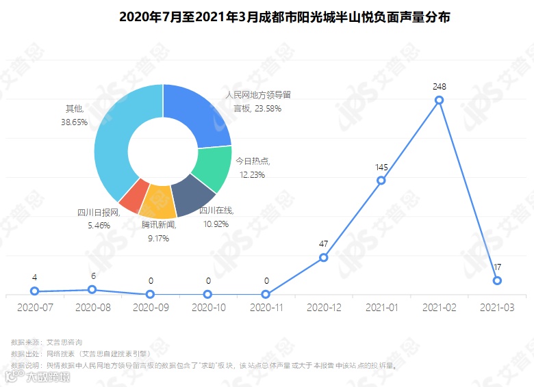 据艾普思自建搜索引擎抓取数据,成都市阳光城半山悦公区装修缩水及虚假宣传的负面信息在去年7月已有少量传播,12月中旬起舆情声量逐渐抬升,并于今年2月达到峰值(248条),相关信息主要分布在人民网地方领导留言板、今日热点、四川在线、腾讯新闻等站点。