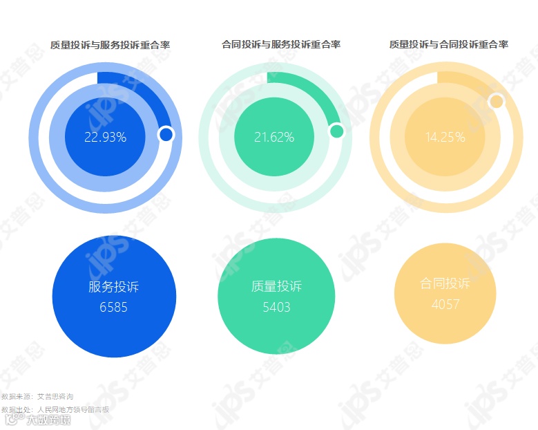 合同投诉与服务投诉重合率22.62%,质量投诉与服务投诉重合率与前者接近,为22.93%,质量投诉与合同投诉重合率仅14.25%。由此可见,合同投诉、质量投诉常常伴随着服务纠纷,出现合同或质量问题时,业主往往会通过与开发商或物业沟通寻求解决,若相关责任方推诿、不予解决,很容易进一步引发服务投诉。