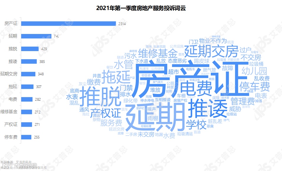 办证服务投诉1,738起,主要涉及无法办理房产证;交房服务投诉1,349起,主要涉及延期交房;服务态度相关投诉1,221起,工作人员办事推诿、态度恶劣、威胁等问题出现较多。