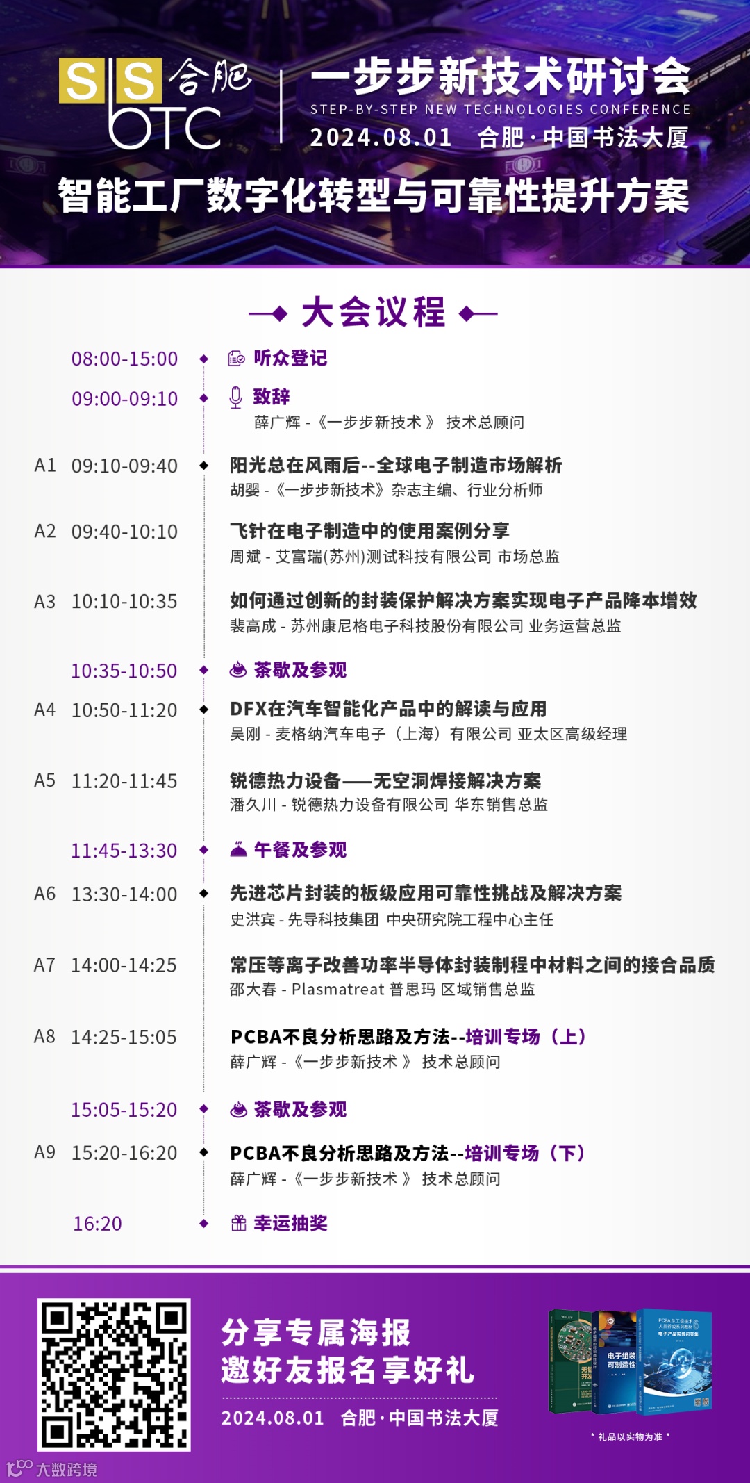 2024年8月1日,一步步新技术研讨会将来到美丽的合肥,在合肥·书法大厦(蜀山区科学大道69号)以“智能工厂数字化转型与可靠性提升方案”为主题举办研讨会。研讨会将面向合肥及长三角周边各专业领域的电子制造业观众,致力于推动安徽省电子制造产业发展,凝聚国内外一流的智能制造资源,促进交流、建立与国际接轨的智能制造产业服务平台。