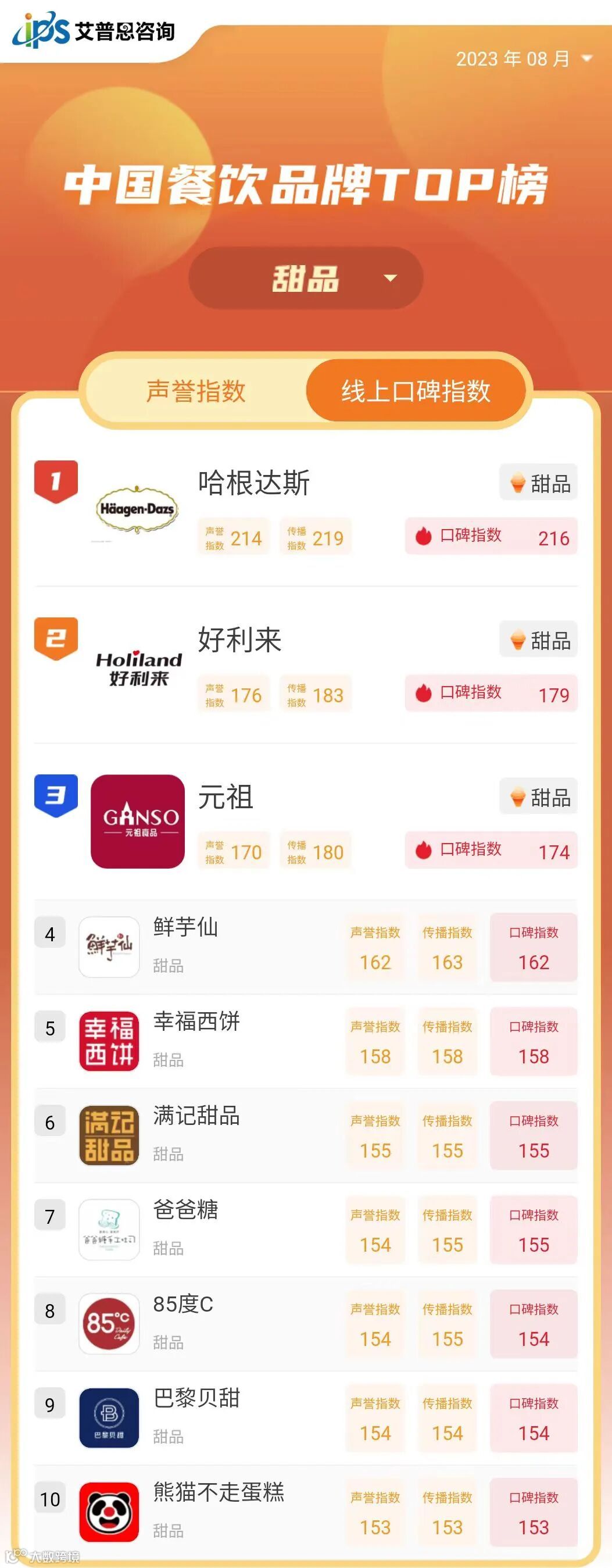 线上口碑指数排名前三的甜品品牌为:哈根达斯、好利来、元祖*;线上口碑指数排名前三的饮品品牌为:蜜雪冰城、喜茶*、星巴克;线上口碑指数排名前三的日韩料理品牌为N多寿司、韩宫宴、大渔铁板烧*;线上口碑指数排名前三的西餐品牌为豪客来、gaga、王品牛排。