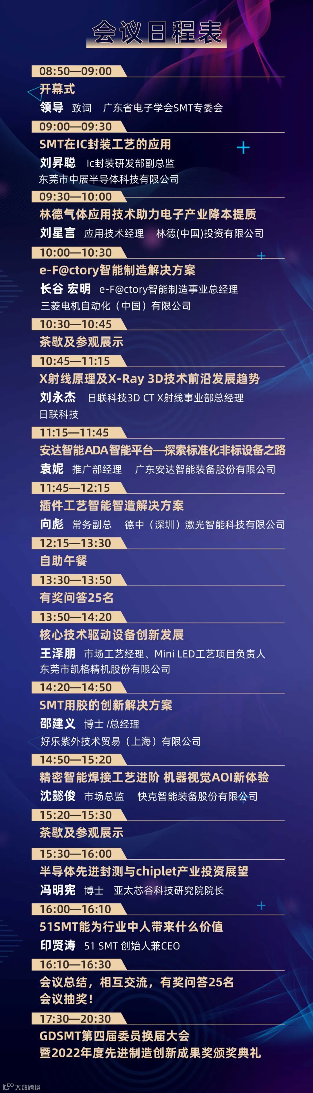 会议当天晚上我们将安排“GDSMT第四届委员会换届大会”及“2022年度先进制造创新成果奖颁奖典礼”晚宴,颁发“GDSMT第四届委员证书”及“2022年度先进制造创新成果奖”、“2022年度先进制造最佳用户服务奖”及“2022年度智能制造企业匠心奖”主要表彰他们的自主创新精神以及为广大行业客户提供的优质服务。