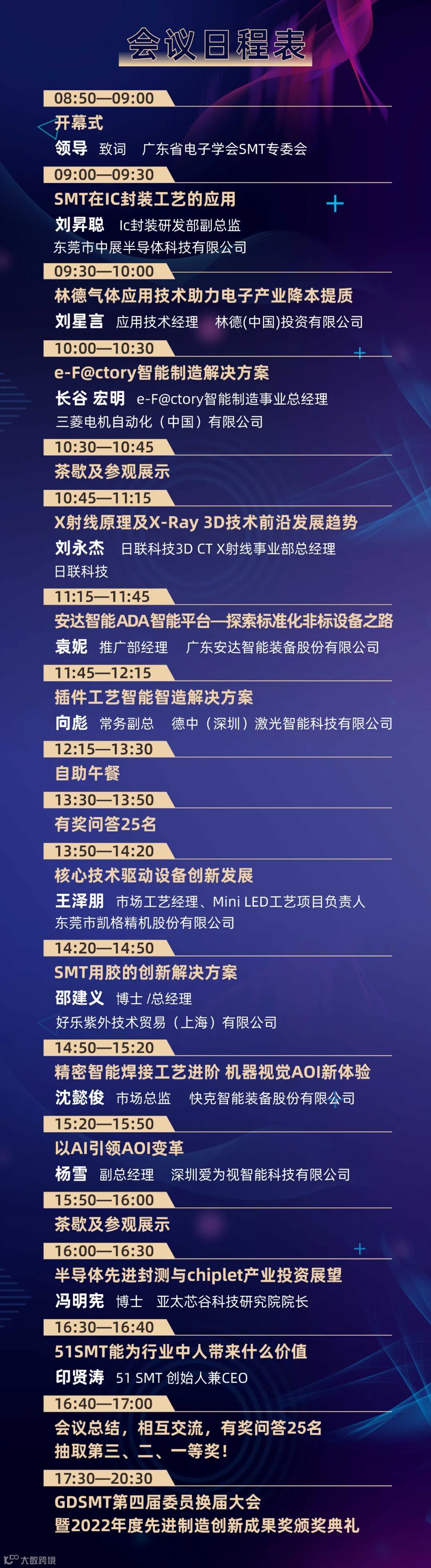 会议当天晚上我们将安排“GDSMT第四届委员会换届大会”及“2022年度先进制造创新成果奖颁奖典礼”晚宴,颁发“GDSMT第四届委员证书”及“2022年度先进制造创新成果奖”、“2022年度先进制造最佳用户服务奖”及“2022年度智能制造企业匠心奖”主要表彰他们的自主创新精神以及为广大行业客户提供的优质服务。