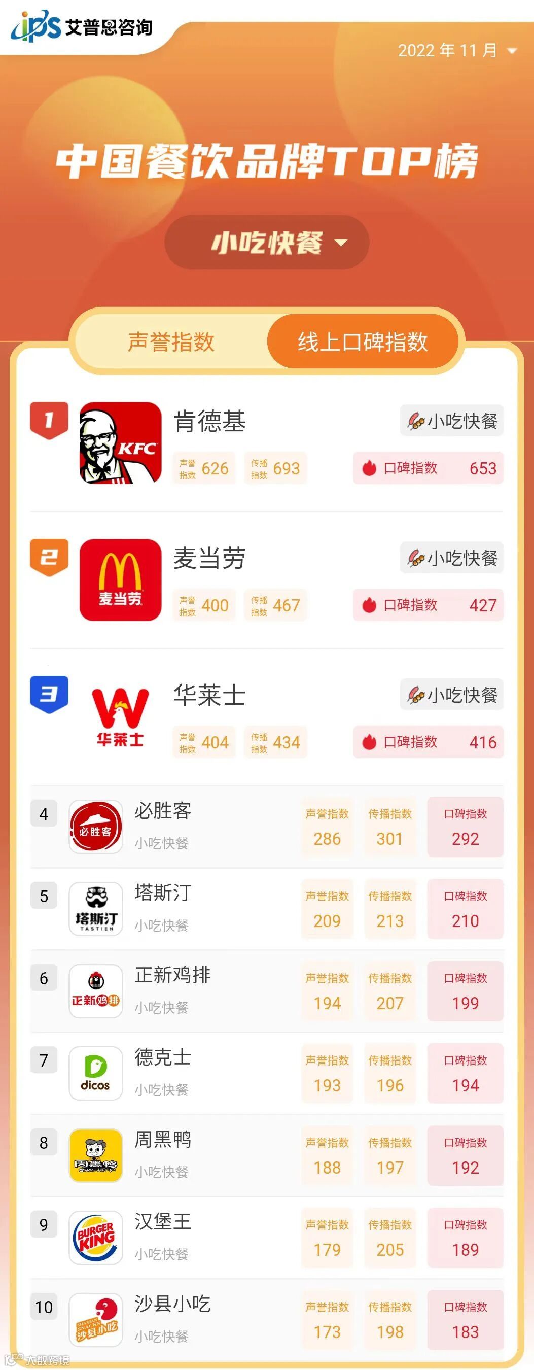 从子指数的表现来看,11月传播指数与声誉指数最高的餐饮品牌均为肯德基(传播指数693,声誉指数626)。