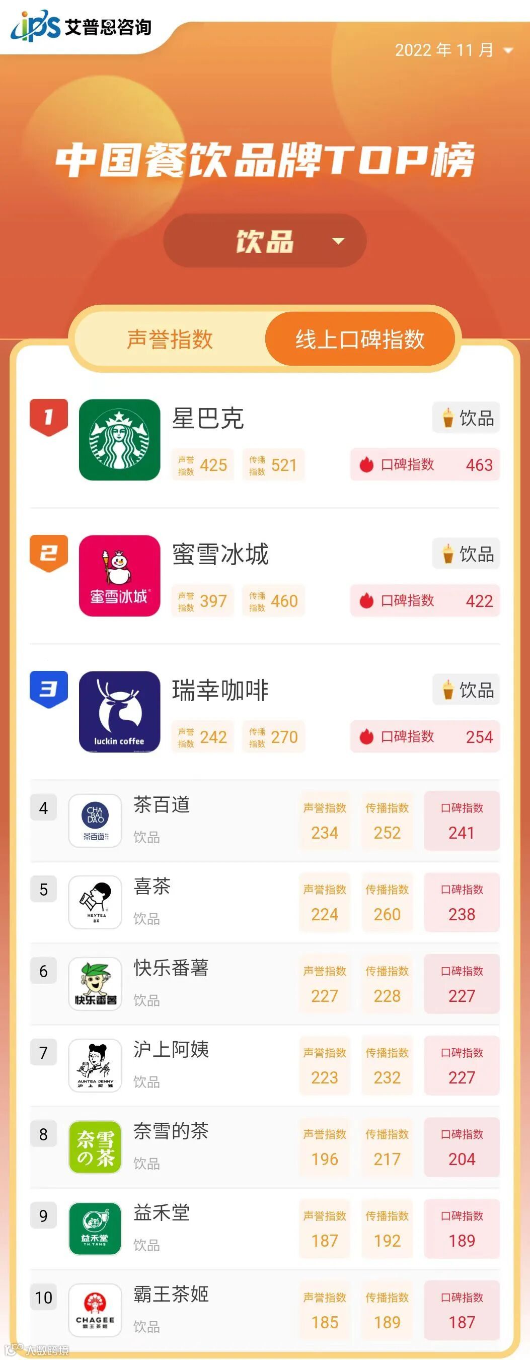 11月线上口碑指数排名前三的餐饮品牌为:肯德基(小吃快餐,口碑指数653,排名与上月持平)、海底捞(火锅/串串,口碑指数522,排名与上月持平)、星巴克(饮品,口碑指数463,排名较上月上升1位)。