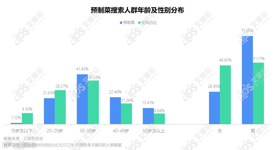 从搜索人群的年龄分布来看,30岁以上群体占比77.24%,高出全网网民该年龄段人群占比近15个百分点。同时,搜索预制菜的男性占比为73.05%,高出全网网民男性人群占比近22个百分点。