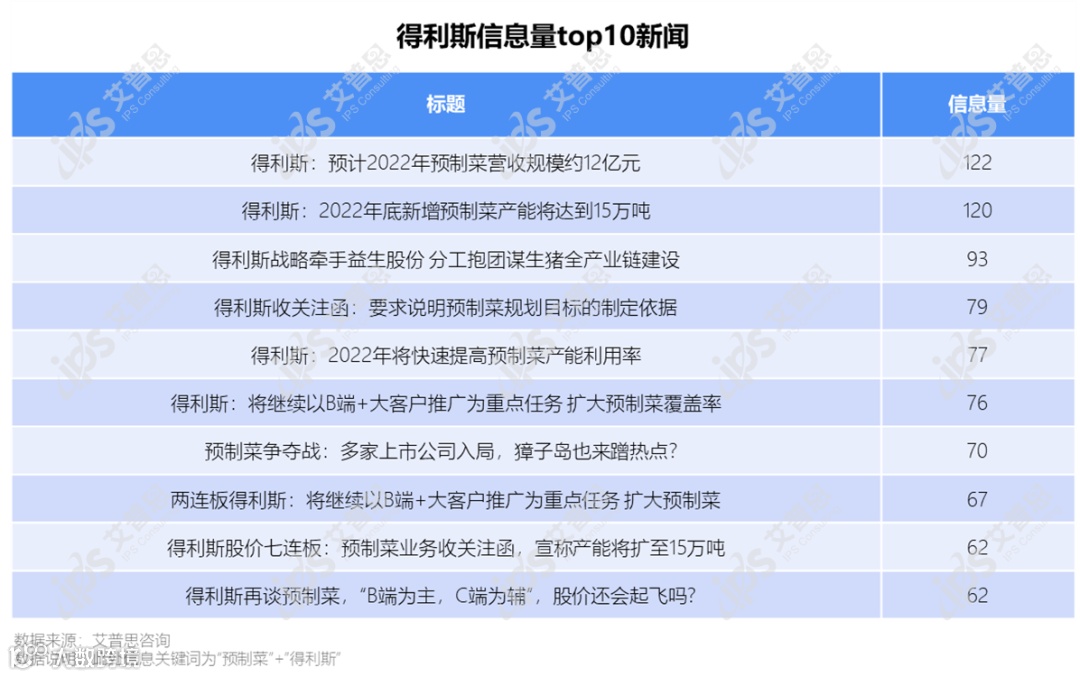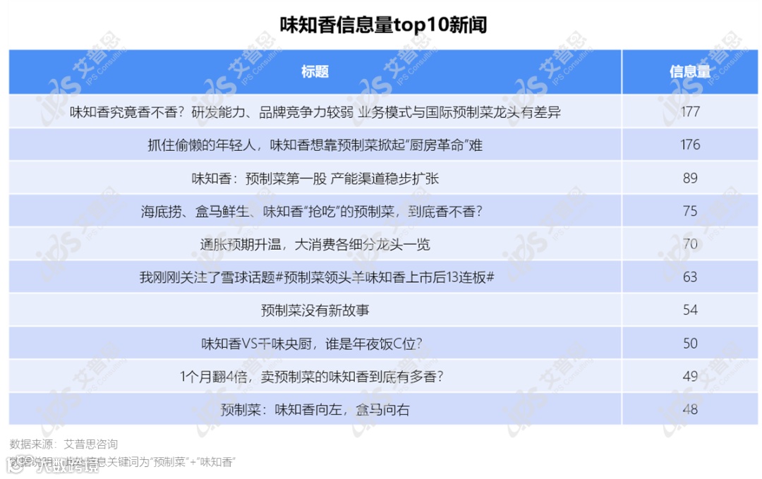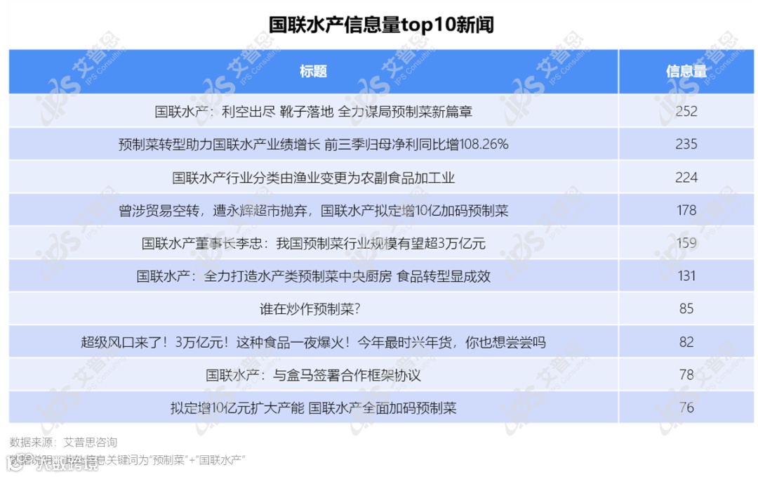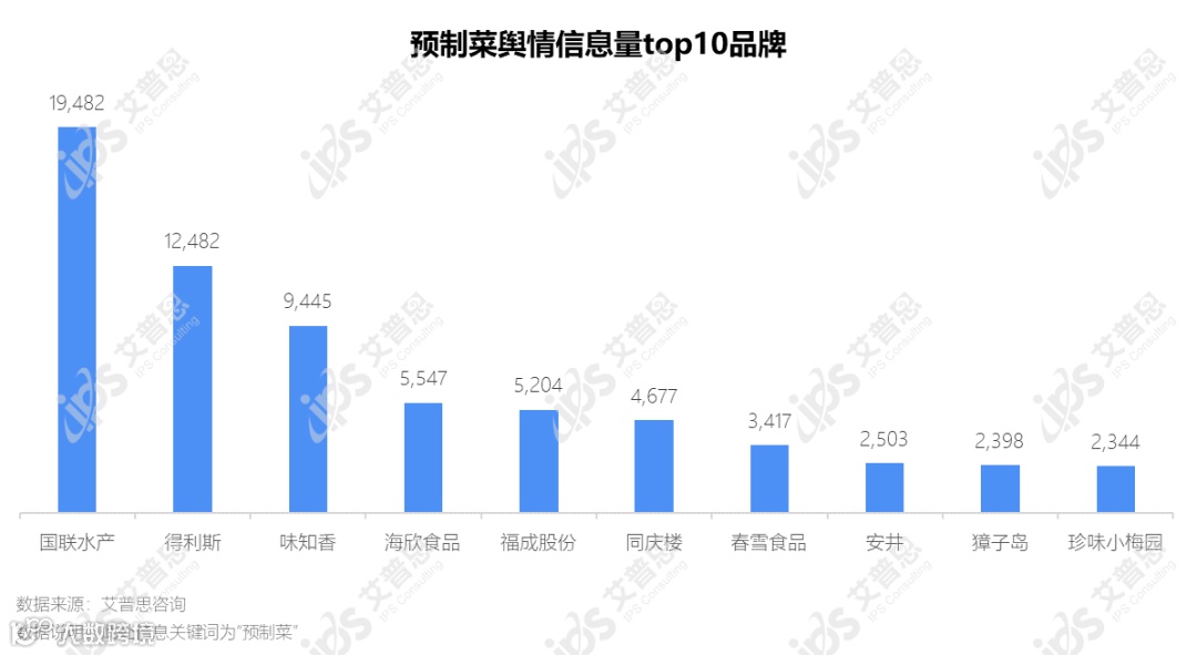 从监测期内预制菜相关企业的舆情声量来看,国联水产(19,482)、得利斯(12,482)和味知香(9,445)排行前三;前三品牌相关声量top10信息中,以其拟定增资扩大预制菜产能,稳步扩张等报道居多,可见预制菜市场风起云涌,必有一番龙争虎斗。